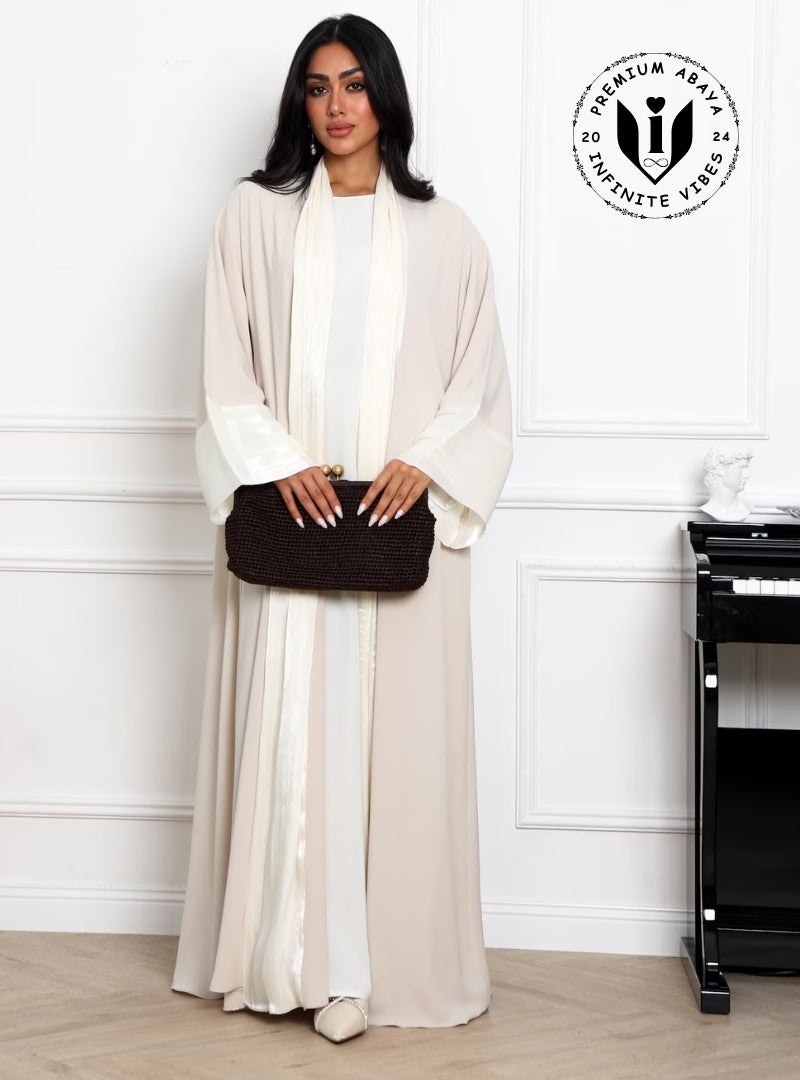 Elegant Premium Beige Abaya with organza Detailing With Dress & Sheila | Infinite Vibes Modest Fashion